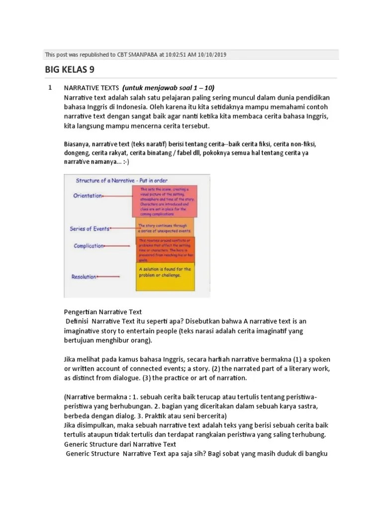 Selain itu mereka juga harus memahami unsur intrinsik, generic structure, dan juga menganalisa moral value dari cerita. Contoh narrative text dengan generic structure: Narrative teks the legend of malin kundang, terjemahan dan moral valuenya. Most stories are build in . Ciri teks narrative adalah adanya unsur kinflik (masalah) dan resolusi.